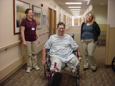 Thanks to Grandma Joyce, here are a bunch of pictures from the past two weeks, both at IMC and Aspen Ridge rehab. Yesterday, he met with the prosthetist to start some of the initial fittings for his C-Leg. He has physical and occupational therapy everyday. He is able to eat just about anything, but his stomach shrunk so much from the feeding tube that he barely has an appetite. He has been working on an assisted slide transfer into the wheelchair, instead of the 6-step transfer that wore him out. He typically has his appointments in the morning, takes a nap after lunch, and then most of the visitors come in the evening.