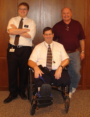 I talked to my dad today to wish him a happy Easter, and was sad to hear him a little downtrodden. Although his recovery is going steadily, it’s coming slowly. It’s been 10 weeks since the accident, and he’s got another 4-5 weeks to go in Aspen Ridge. Above is a picture that was taken with Bruce and Nathan; the three survivors of the horrendous accident that took my dad’s leg and almost took his life. He was able to take his first field trip out into public, and went to the Church Office Building to see his coworkers. His work group was very cordial and glad to see his health improving so much. But on this trip, he also needed to go to the church travel office to get his renewal passport photo taken. The assistant in the office made the comment, “Looks like you got into a fight with a snowblower and it won.” Although the employee probably meant to make my dad laugh…it really hurt. It was the first truly insensitive comment that he’s encountered since the accident.