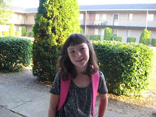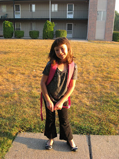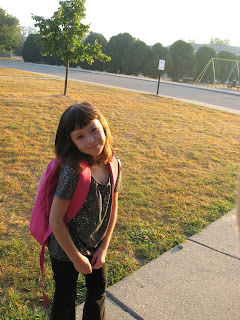 Rosie started 2nd grade yesterday. I had to leave for work 45 minutes before Rosie had to get up and ready for school, so Taylor took a few pics to document the morning. Rosie chose a sparkly silver shirt, black cords, and her new Hannah Montana flats. Rosie likes to remind everyone that she will be a tween next week. Just over a week till she turns 8!
