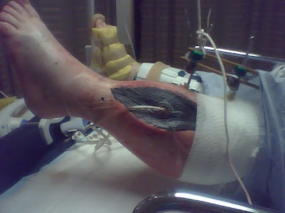 Over the next few days, several more surgeries were required. Unfortunately, the trauma of the crush wound was too severe and his left leg was amputated. It was originally expected to be amputated just below the knee, but the necrosis had spread further up, and the amputation was done at mid-thigh.