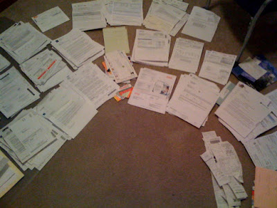 I decided to tackle the dreaded pile tonight. Junk mail, statements, bills, magazines, receipts…I was determined to open every single envelope (some still unopened from July!) I opened over 200 envelopes. In two hours, I had made 33 piles on the floor. My next quest is to actually LOOK at the mail, figure out what payments are due, and file them in an orderly way. I’ve NEVER gone this long without organizing my paperwork…and I couldn’t take it anymore!