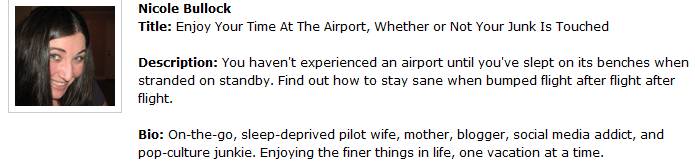 My presentation title: Enjoy Your Time at the Airport, Whether or Not Your Junk is Touched – How to stay sane at the airport when bumped flight after flight after flight.”