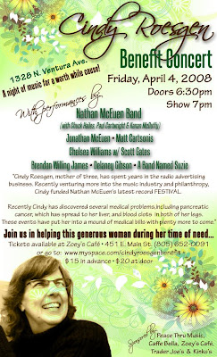 Before I blog about my trip to the doctor yesterday, I wanted to put in a plug for the Cindy Roesgen Benefit Concert. Cindy’s story is outlined if you click on the above picture. She’s the one who financed my friend Nathan McEuen’s last album “Festival,” and is currently suffering from a myriad of maladies including Pancreatic Cancer. If you’re in the Southern California area and want an evening of amazing music…please attend!