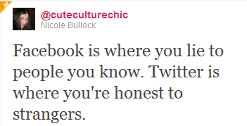 A lifeline: Sometimes when I’m having a down day, and I tweet about it, I’ll get replies of sympathy, empathy, and encouragement. On a particularly horrible day, I just needed to know that somebody out there cared. I had over 50 people reply and tell me why I’m special, loved, and important in their lives. It made SUCH a difference. It’s also allowed me to be there for others who are struggling…whether it be from depression, suicidal feelings, or boredom. I like to joke that Facebook is where you lie to people you know, Twitter is where you’re honest to strangers.